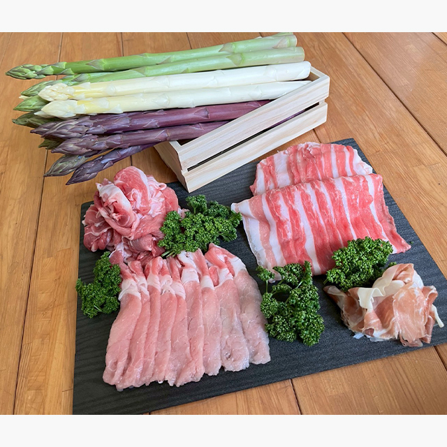 | 内容量 | 雲仙ふふふのアスパラ3種(L~2Lサイズ グリーン10~12本/約400g・パープル5~7本/約200g・ホワイト5~7本/約200g)※パープルは熱を加えると鮮やかな緑に変色します。 諫美豚しゃぶしゃぶ用薄切り(バラ200g、ロース100g)、諫美豚切り落とし(モモ・ウデ)200g、ハモンセラーノ・ドイ18g(黒豚諫美豚プレミアム100 原木生ハム) |