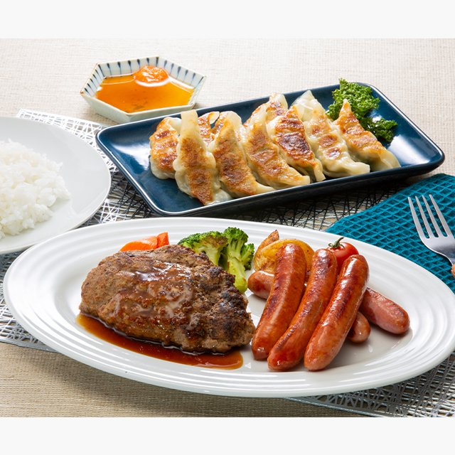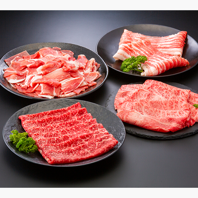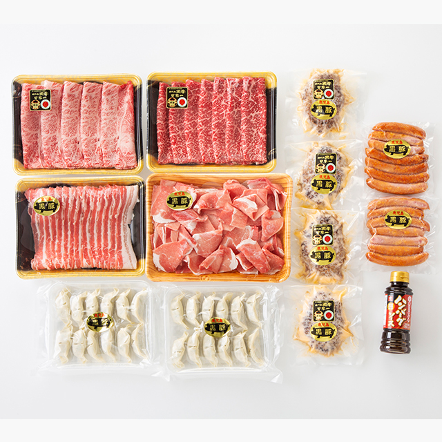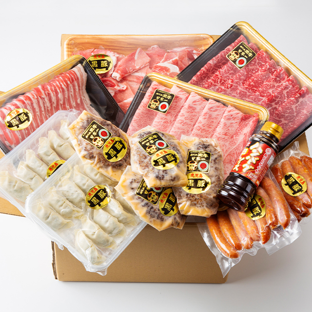 | 内容量 | 黒牛肩ロースうす切り:300g、黒牛モモうす切り:300g、黒豚バラうす切り:300g、黒豚切り落とし:500g、黒×黒ハンバーグ(調理済み)×4個、ハンバーグソース220ml×1本、黒豚ぎょうざ(12個入り)×2P、黒豚ウインナー200g×2P |