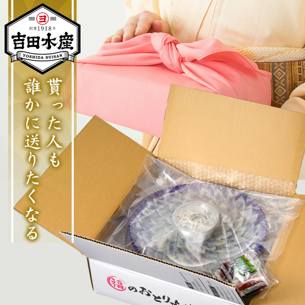 創業大正7年、皇室献上の実績もある、歴史と信頼を誇る下関市の老舗ふぐ問屋「吉田水産」。今回は天然まふぐの刺身が届きました。しかも、通常4,480円(送料・税込み)のところを、約20%OFFの3,580円(送料・税込み)でご提供!吉田水産は、仕入れから加工・出荷まで一元管理して行い安全安心で美味しいふぐをお届けします。の絶品の北海道産まふぐのお刺身をこの機会にぜひご堪能ください!