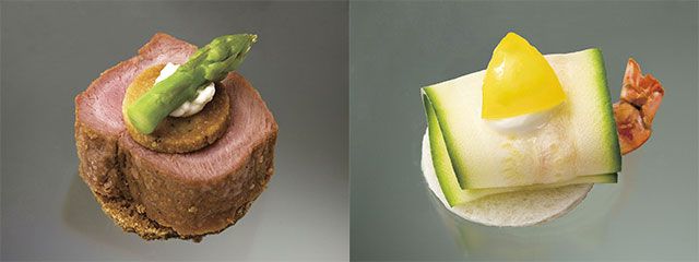 (左)仔牛の西洋わさび添え(右)海老のズッキーニ包み