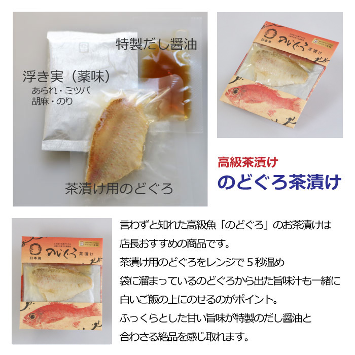| 内容量 | のどぐろ茶漬け×2食、めで鯛茶漬け×2食、あなご茶漬け×2食、焼さば茶漬け×2食 |