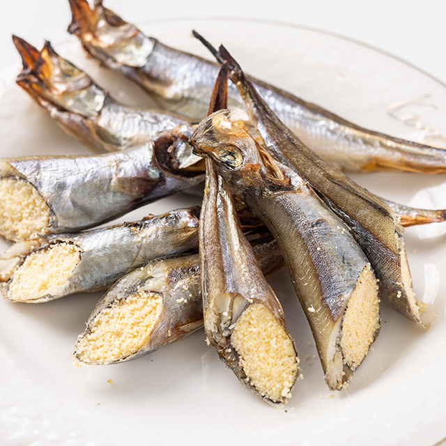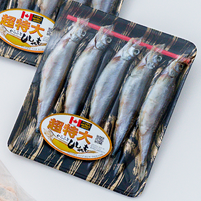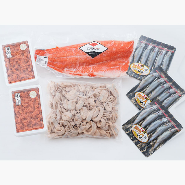 セット内容:アタカマソルトサーモン 1枚、九州産いか唐揚げ 1㎏、子持ちカラフトししゃも5尾特大パック×3P、無着色辛子明太子バラ子500g×2P