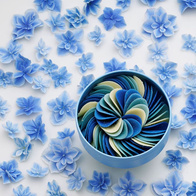 青のグラデーションが目を引く華やかな花びら(=ペタル)型のチョコレート『インディゴペタル』。パリッと薄い花びらは、口溶けがよく、甘みと芳醇な香りが口の中に広がります。