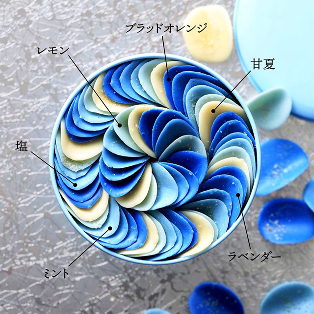 テイストは、濃い青色から薄い色へ順に「ブラッドオレンジ」・「ラベンダー」・「塩」・「ミント」・「レモン」・「甘夏」です。身体にダメージを与えないオーガニックと天然素材でできているので、幅広い世代の方に喜ばれます。蓋を開けた瞬間、美しく並んだ花びらに感動が生まれます。ブルーを基調としたパッケージも素敵です。